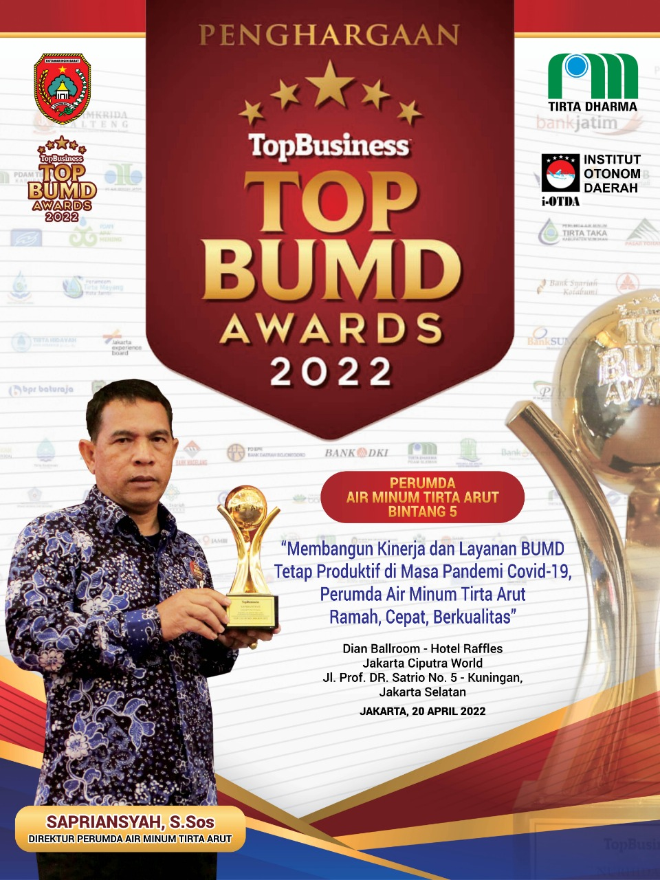 Perumdam Tirta Arut -- Direktur Perumda Air Minum Tirta Arut (Sapriansyah, S.Sos) sedang memegang piala Top Business BUMD Awards 2022